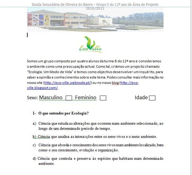:. O inquérito destina-se à turma do 11º ano A, do curso de Ciências e Tecnologias, da Escola Secundária de Oliveira do Bairro.